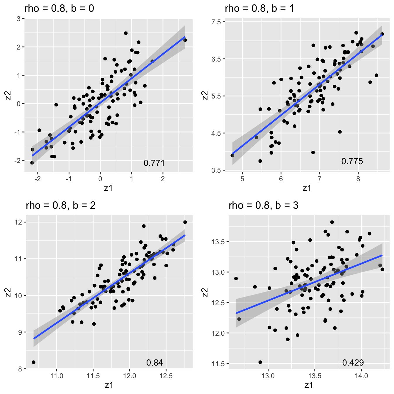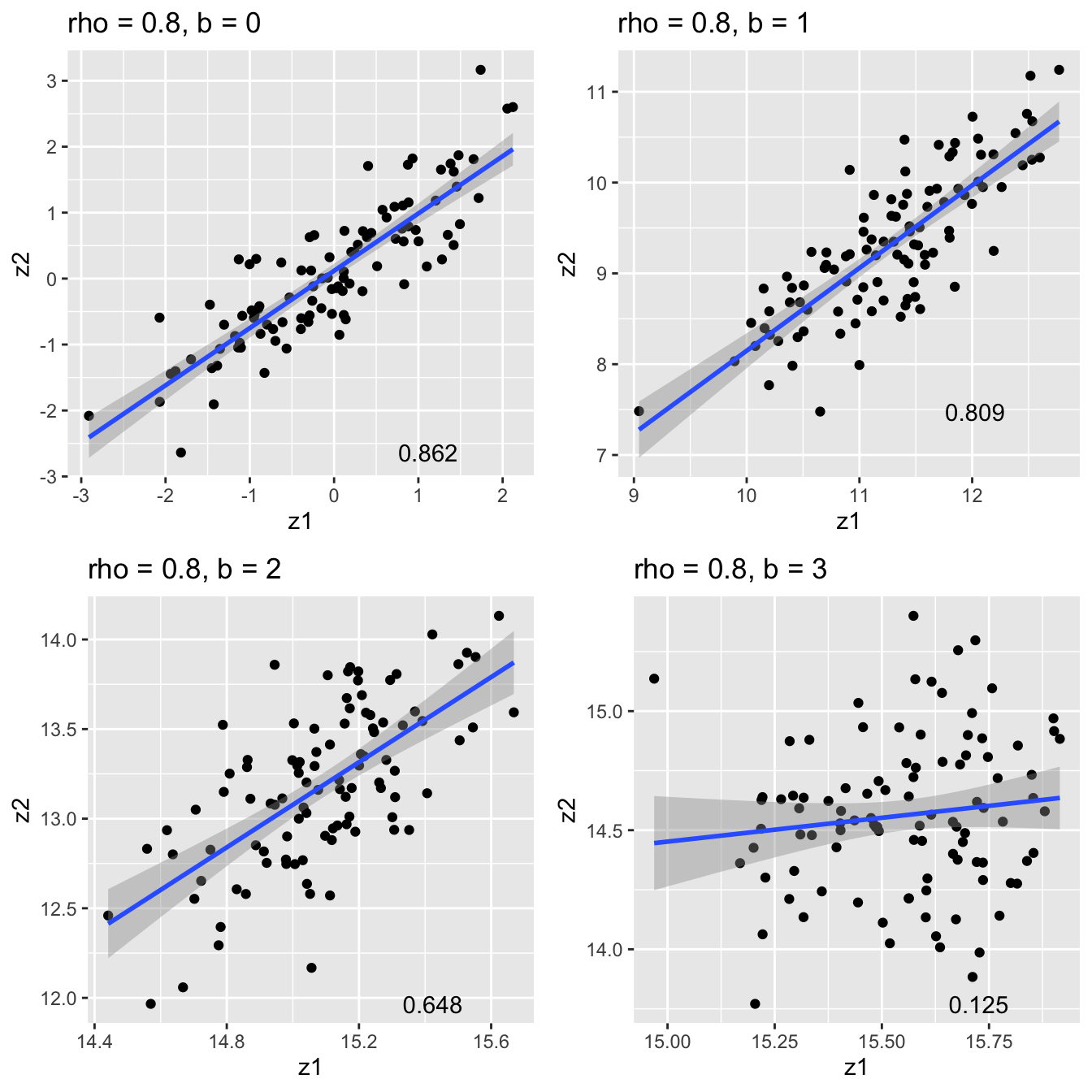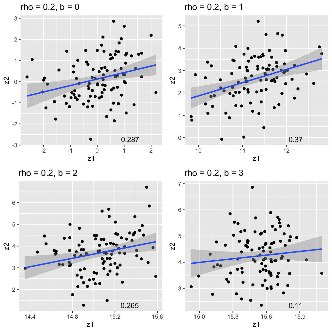 We fix \(\rho = 0.8\) and vary \(b = 0, 1, 2, 3\). As the effect size grows, the correlation between the marginal \(z\)-scores \(z_1\) and \(z_2\) decreases.